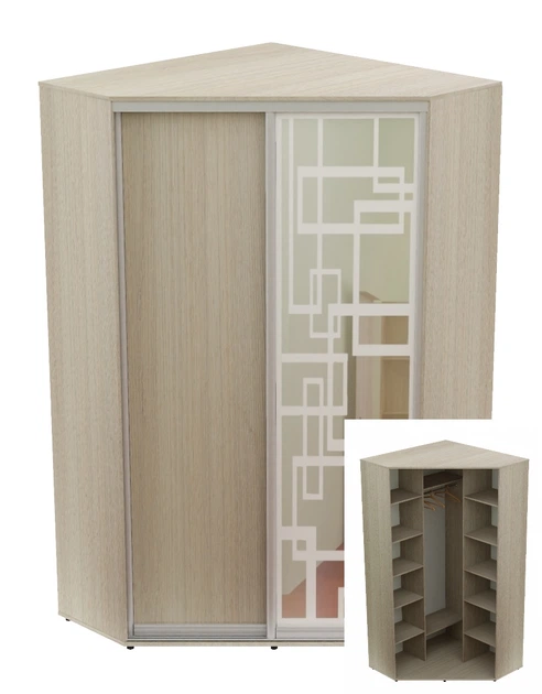 Шафа-купе дводверна кутова Алекса 130*130*230 Дуб молочний ДСП/Дзеркало з піскострумним малюнком Угол-3