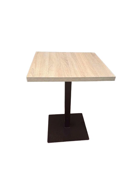 Стіл з квадратною стільницею, матеріал HPL, розмір стільниці 80*80 см, товщина 25 мм, металева чорна основа, пофарбована епоксидною фарбою, висота 73 см, основа внизу кругла, діаметр 45 см, товщина круглої основи 8 мм, кріплення вгорі 23*23 см, діаметр труби 76 мм. Стільниця універсальна і не має отворів під дану опору, для установки необхідно намітити місця для кріплення і прикрутити опору фурнітурою, що йде в комплекті. Застосування усередині приміщень.