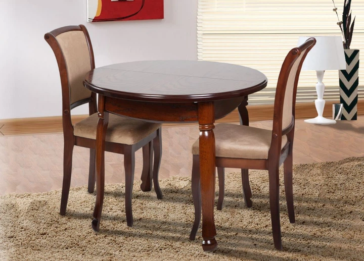 Дерев'яний стіл круглий зі стільцями м'якими 2 шт для вітальні лак горіх
