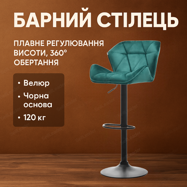 Барний стілець регульована висота зі спинкою газліфт поворотний Bonro B-087 велюр зелене чорна основа 120 кг