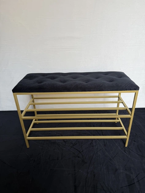 Банкетка для взуття 60*32*52 см чорна із золотистим каркасом, велюрова підставка для взуття на 2 полички
