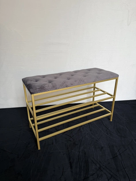Банкетка для взуття 60*32*52 см темно-сіра із золотистим каркасом, велюрова підставка для взуття на 2 полички