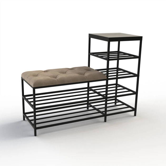 Банкетка з полицею для взуття каретна стяжка Mzavod 100 см, Чорний каркас, Бежева тканина, Чорний