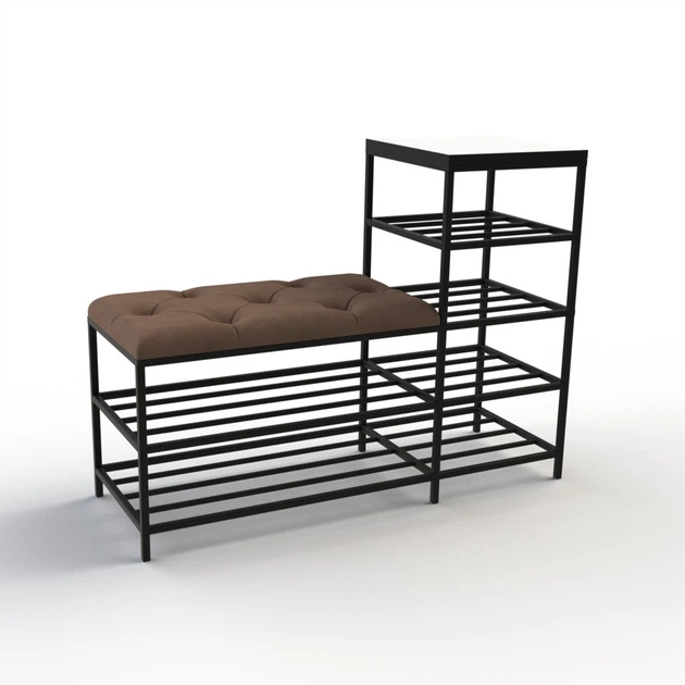 Банкетка з полицею для взуття каретна стяжка Mzavod 100 см, Чорний каркас, Сіро-коричнева тканина, Горіх каліфорнійський