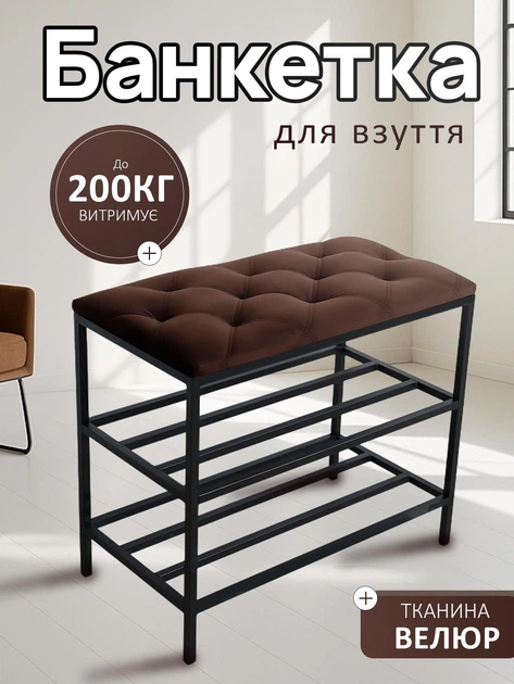 Банкетка для взуття 60*32*52 см, м'яка велюрова банкетка 2 полички коричнева, пуф поличка для взуття прошита