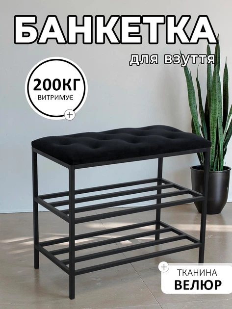 Банкетка для взуття 60*32*52 см, м'яка велюрова банкетка 2 полички чорна, пуф поличка для взуття прошита