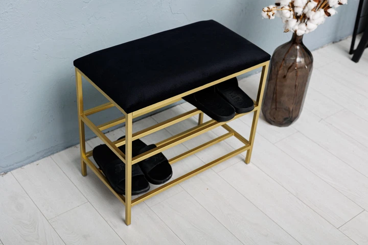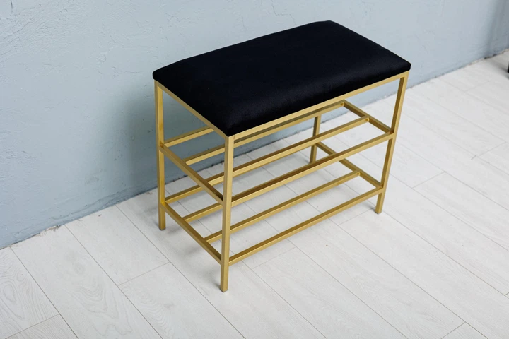 Банкетка для взуття 60*32*52 см чорна із золотистим каркасом, велюрова підставка для взуття на 2 полички не прошита