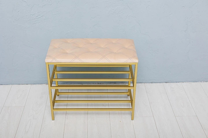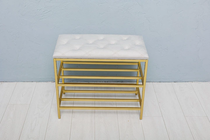 Підставка для взуття 60*32*52 см бежева із золотистим каркасом, велюрова підставка для взуття на 2 полички