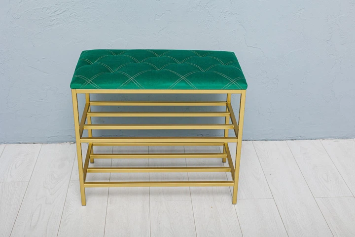 Підставка для взуття 60*32*52 см смарагдова із золотистим каркасом, велюрова підставка для взуття на 2 полички
