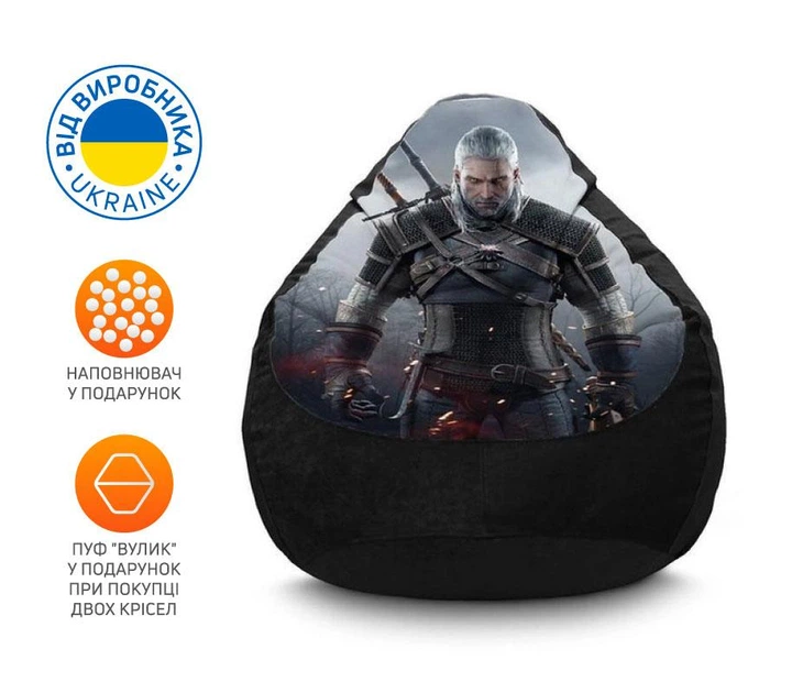 Крісло груша iPuff "Відьмак. Геральт" Флок XXXL (100х135 см) Чорний