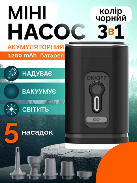Електричний портативний бездротовий міні насос вакуматор ліхтарик для надувних матраців на акумуляторі 3 в 1 чорний