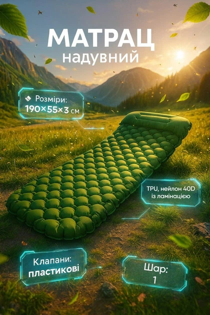 Надувний туристичний матрас для палатки 190х55х3 см Хакі з водонепроникним покриттям і чохлом для кемпінгу