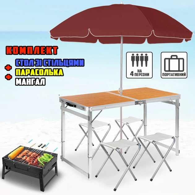 Розкладний туристичний стіл посилений і 4 стільці Easy Campi набір туристичний для пікніка, у валізі Світле дерево + Парасол