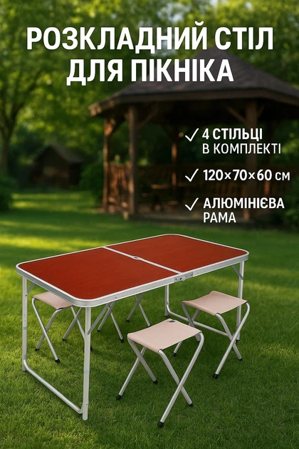 Розкладний туристичний стіл з 4 стільцями для пікніка/рибалки 120х60 см, Коричневий