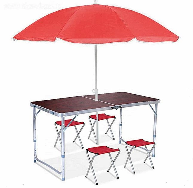 Посилений туристичний складаний стіл з 4 стільцями та парасолькою, Коричневий з червоним