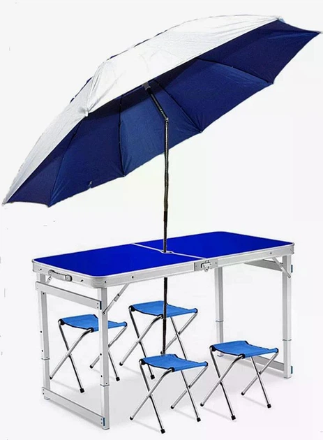 Комплект туристичних меблів: складаний стіл + 4 стільці + складана парасолька, Синя стільниця