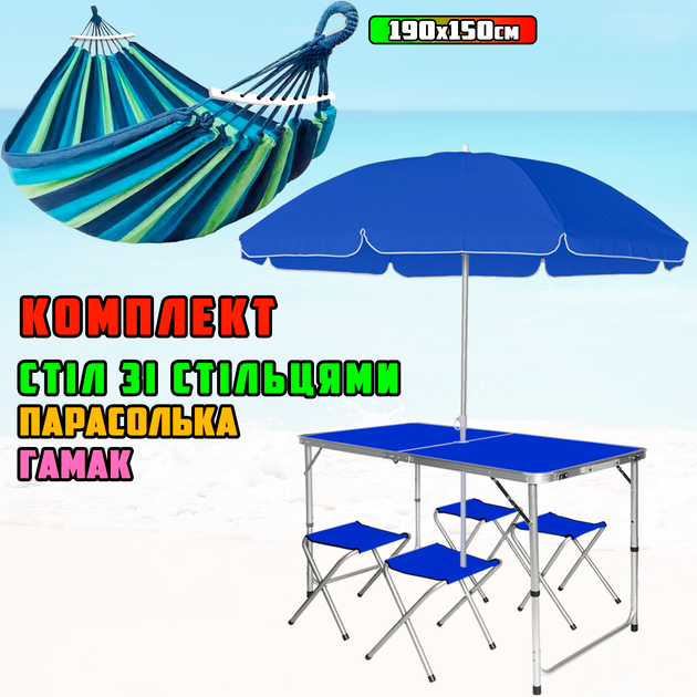 Комплект розкладний стіл та 4 стільці Easy Campi у валізі Синій + парасолька 1.8м + Гамак підвісний з планкою Nature 190x150
