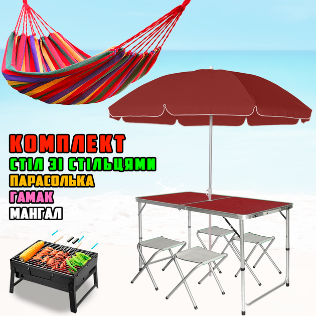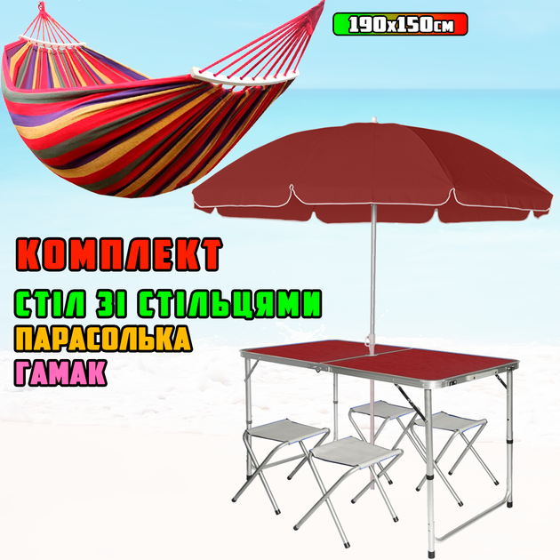 Комплект розкладний стіл та 4 стільці Easy Campi у валізі Коричневий + парасолька 1.8м + Гамак підвісний 200x80 см Червоний