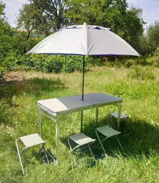 Комплект меблів для відпочинку на природі: розкладний стіл + 4 стільці + компактна парасолька, Біла стільниця
