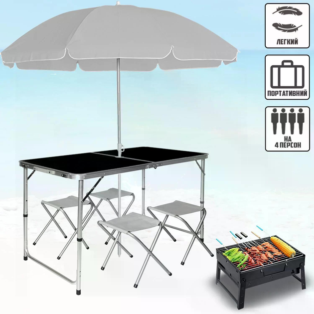 Комплект туристичний розкладний стіл, 4 стільці, парасолька та барбекю для пікніка, кемпінгу, риболовлі