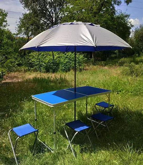 Міцний алюмінієвий складний стіл з 4 табуретами та компактною парасолькою, Синя стільниця