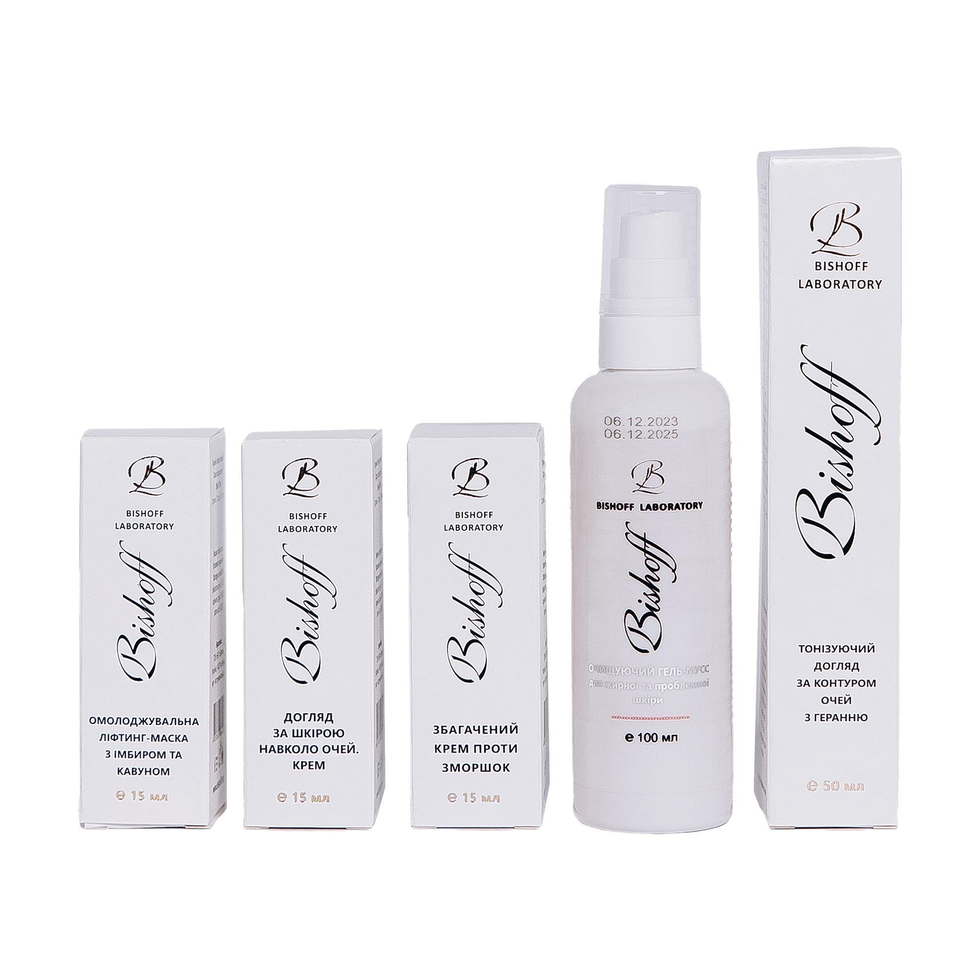 Набір Bishoff для омолодження жирної шкіри обличчя (мус, 100 мл + крем, 15 мл + маска, 15 мл + крем, 50 мл + крем, 15 мл)