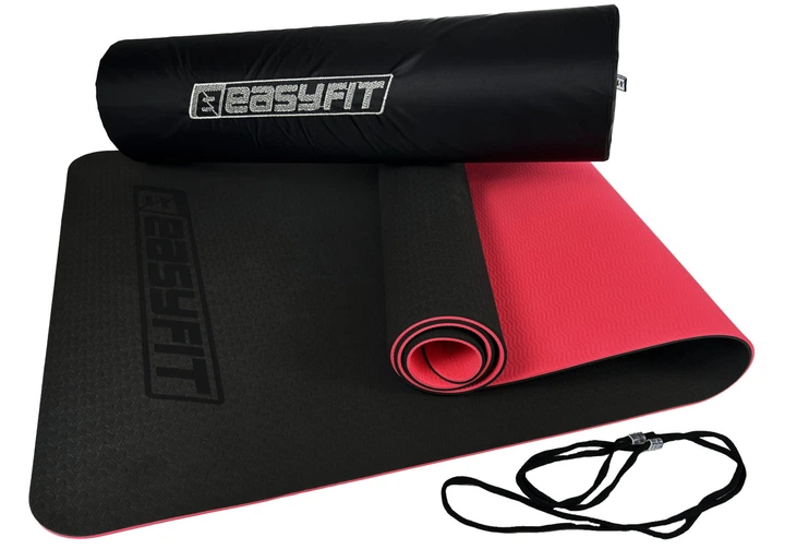 Килимок для йоги та фітнеса EasyFit TPE+TC 6мм двошаровий + Чохол чорний з червоним