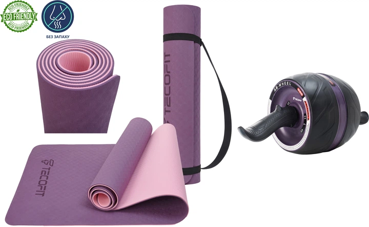 Набір Килимок TECOFIT TPE для йоги та фітнесу 183x 61 x 0.6 см Pink-Purple (TOP18013825) + Колесо для пресу (гімнастичний тр