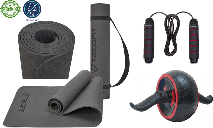 Набір Килимок TECOFIT TPE для йоги та фітнесу 183x 61 x 0.6 см Black (TOP18074471/1) + Колесо для пресу (гімнастичний тренаж
