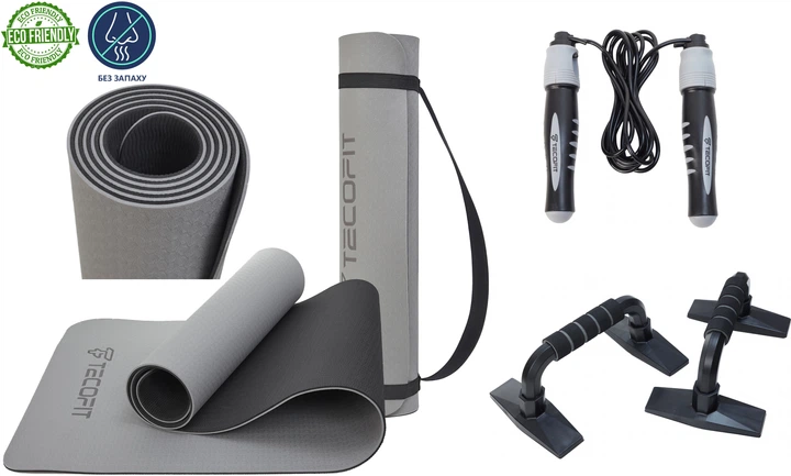 Набір Килимок TECOFIT TPE для йоги та фітнесу 183x 61 x 0.6 см Black-Grey (TOP18013825/1) + Скакалка Tecofit з лічильником (