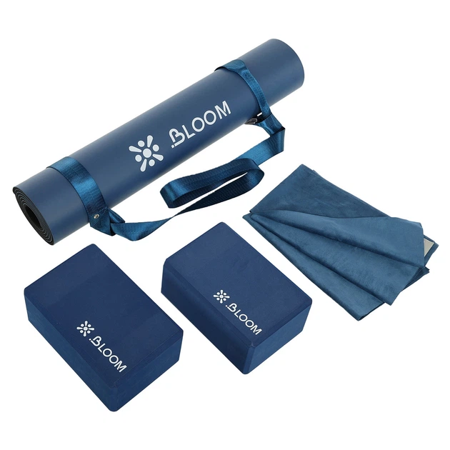 Набір для йоги 4в1 коврик, ремень-стяжка, блок для йоги, рушник для йоги BLOOM LB7101 (EVA, поліестер, нейлон, синій)
