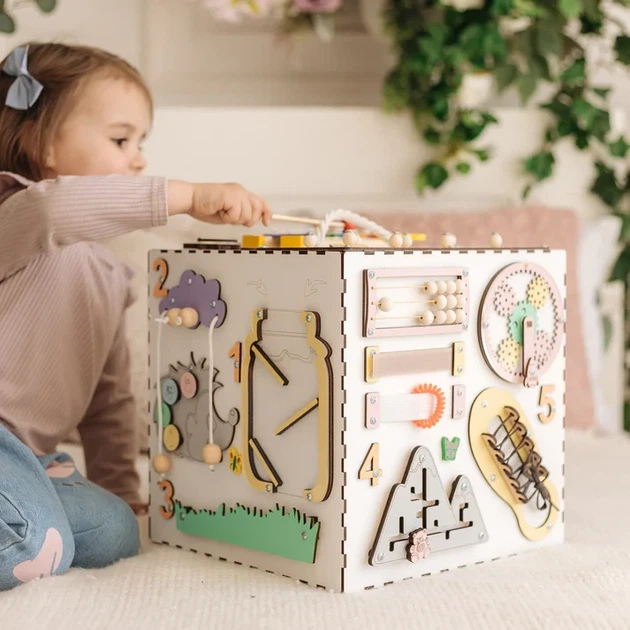 Бізікуб з міцної деревини BusyBoss 30х30 см на 28 елемента + Дошка для малювання!