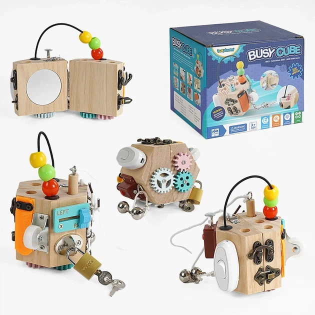 Дерев'яний бізікубік бізіборд кубик розвиваюча іграшка для дітей малюків дівчаток хлопчиків 15х15х15 см Натуральне дерево