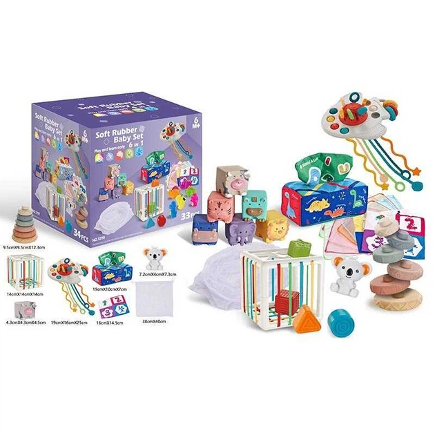 Набір для розвитку 1295 , 33 елементи, кубики, брязкальця, прорізувачі, салфетки, мішечок, куб із формами, в коробці