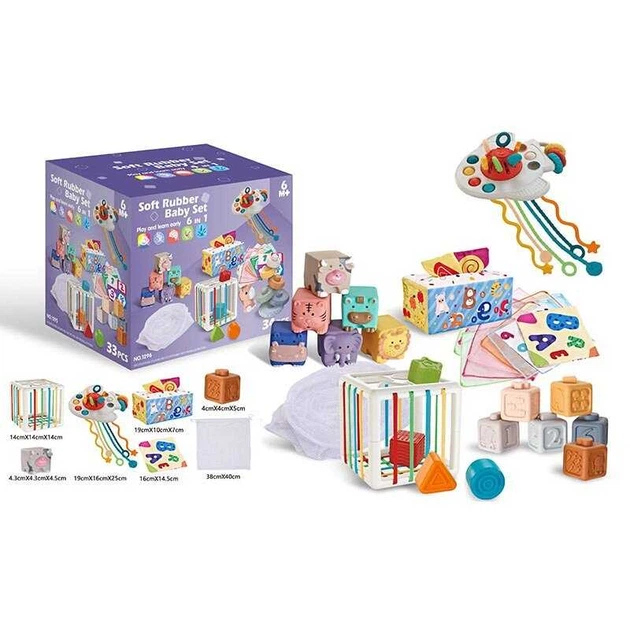 Набір для розвитку на 33 елементи (1295) кубики, брязкальця, прорізувачі, серветки, мішечок, куб із формами