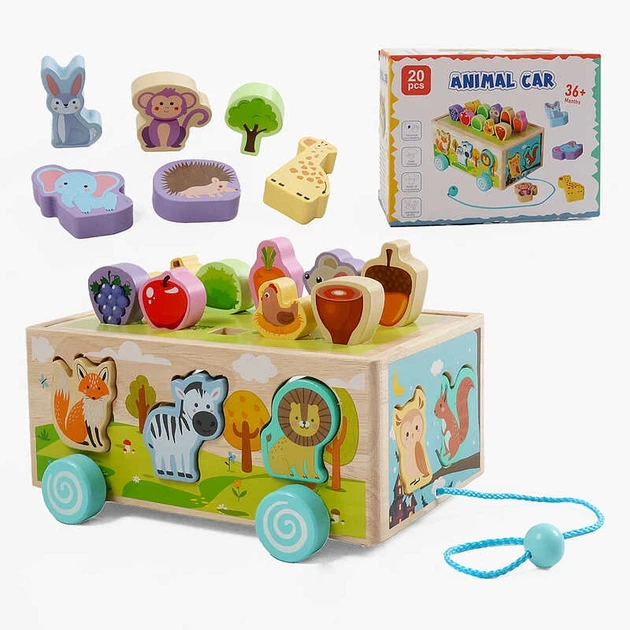 Ігровий центр F 43634 дерев'яний, каталка, сортер за формами, тваринки, фігурки, в коробці