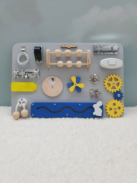Бізіборд Super Toys 20х30 см розвиваюча іграшка 12м+ сірий з жовтим та блакитним