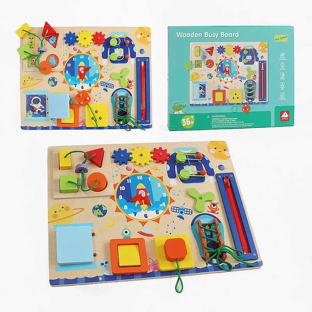 Бізіборд дерев'яний, шестерні, геометричний сортер, спіннер, застібки, годинник, у коробці (C 71020)