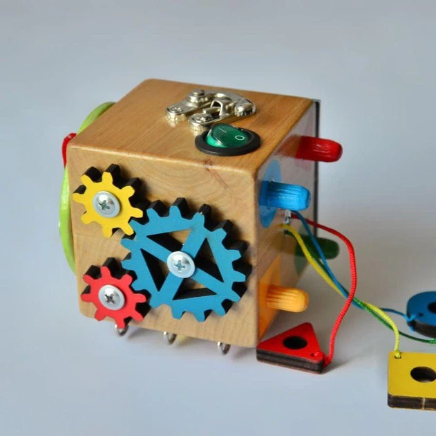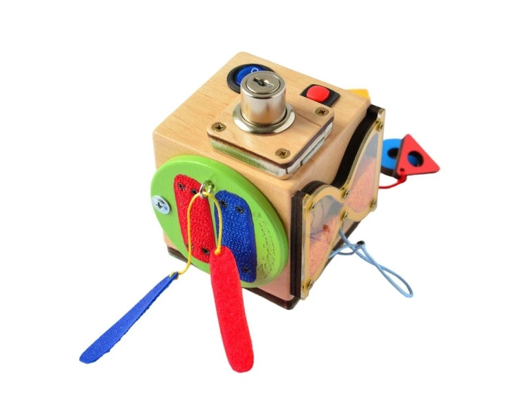 Бізікуб дитячий KolodaToys з червоною намистиною і вимикачами 7х7х7 см Різнокольоровий