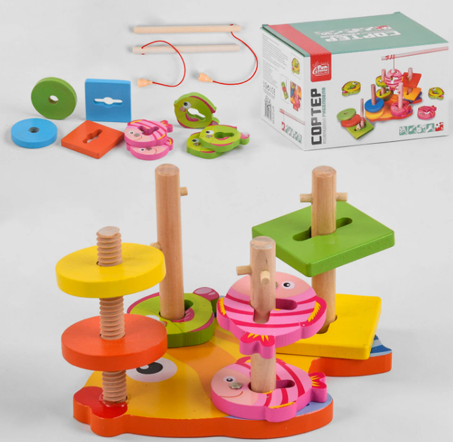 Розвиваюча дерев'яна логічна іграшка Fun Game пірамідка, геометричні фігури, магнітна рибалка, Геометричний сортер Монтессор