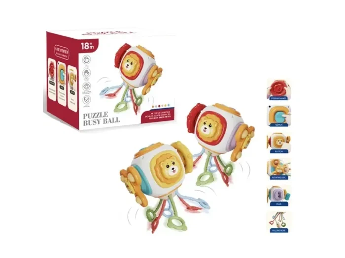 Бізіборд HE 8031 сфера з кульками, 7 забавок, пальчикові ігри, тріскачка, пискавка, 2 фігурки, в коробці