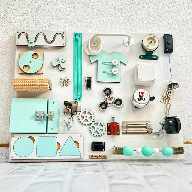 Бізіборд для дітей 50х40см, 25 елементів, Сірий з бірюзовим (Розвиваюча дошка з натурального дерева)