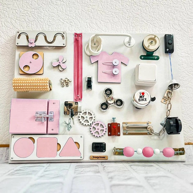 Бізіборд для дітей 50х40см, 25 елементів, Сірий з рожевим (Розвиваюча дошка з натурального дерева)