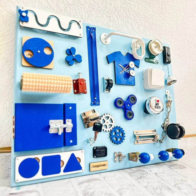 Бізіборд для дітей 50х40см, 25 елементів, Блакитний з синім (Розвиваюча дошка з натурального дерева)