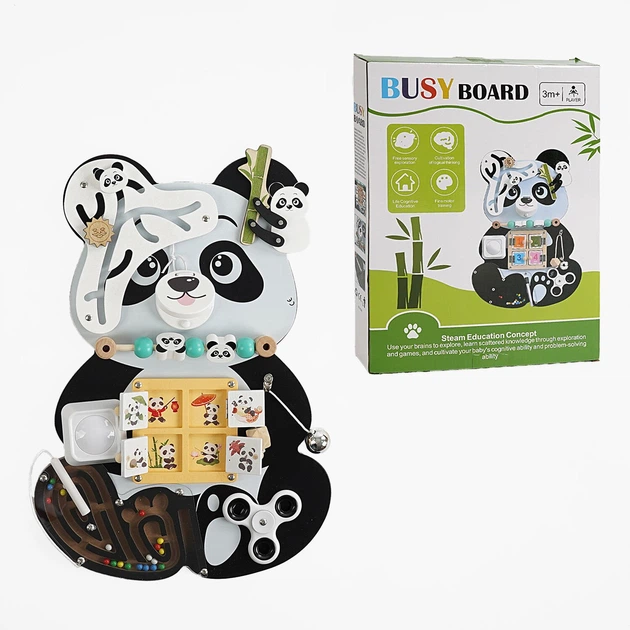 Бізіборд “Панда”, дерев’яний, 9 ігор, пальчиковий лабіринт, магнітна гра, спінер, дверцята, рахівниця, лампа, в коробці