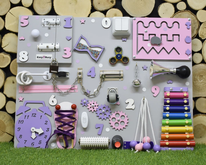 Бізіборд 5060 см – розвиваюча дошка Монтессорі з ксилофоном для дітей з фіолетово-жовтими елементами з персиково-кавовими ел