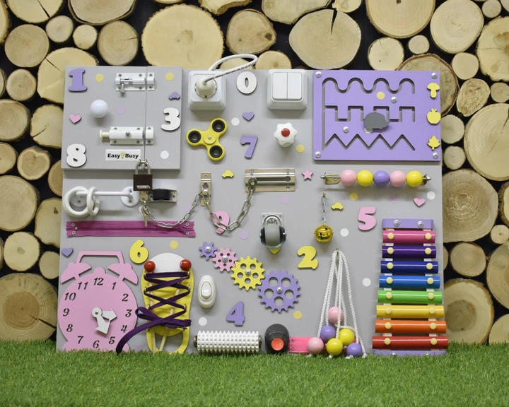 Бізіборд інтерактивна дошка для розвитку дрібної моторики 5060 см фіолетво-жовті елементи