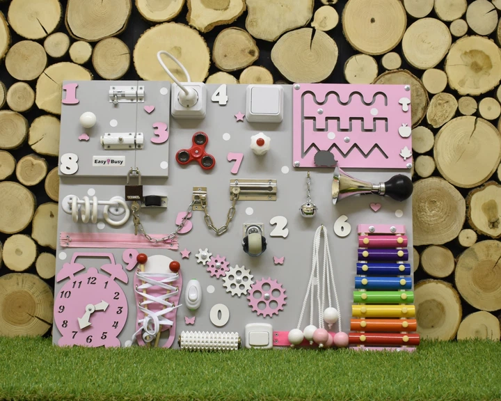 Бізіборд інтерактивний 5060 см – дошка для розвитку дітей з ксилофоном і кнопками, бізікуб рожевого кольору