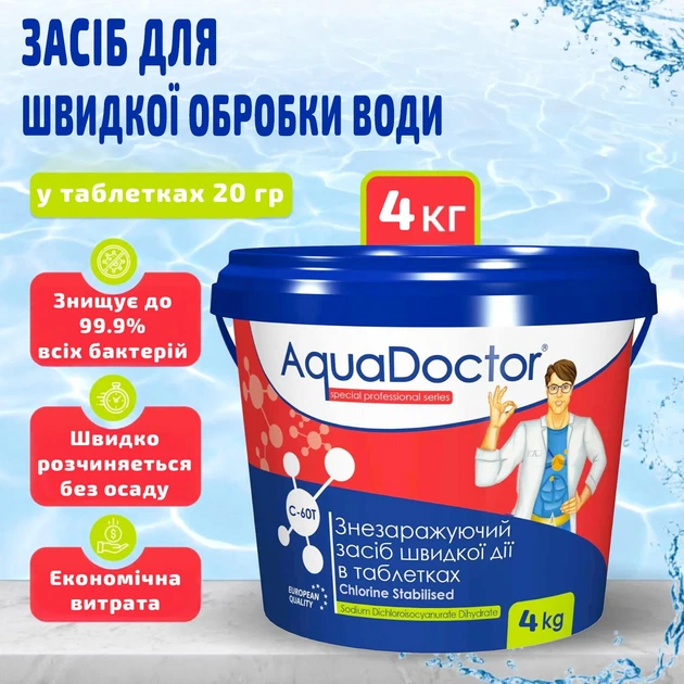 Хімія для басейну AquaDoctor Шок (швидкий) хлор С-60Т 4 кг у таблетках по 20 г для дезінфекції води в басейні