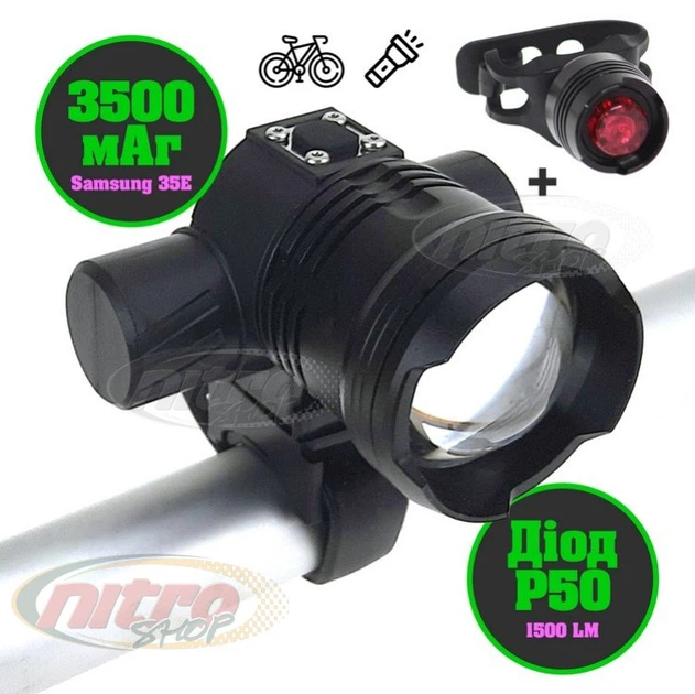 Потужний вело ліхтар velo-58352-1 18650 3400мАч Samsung-35E діод P50 і задній червоний габарит комплект